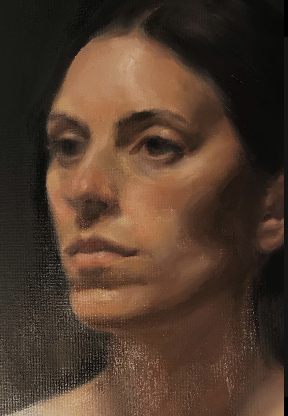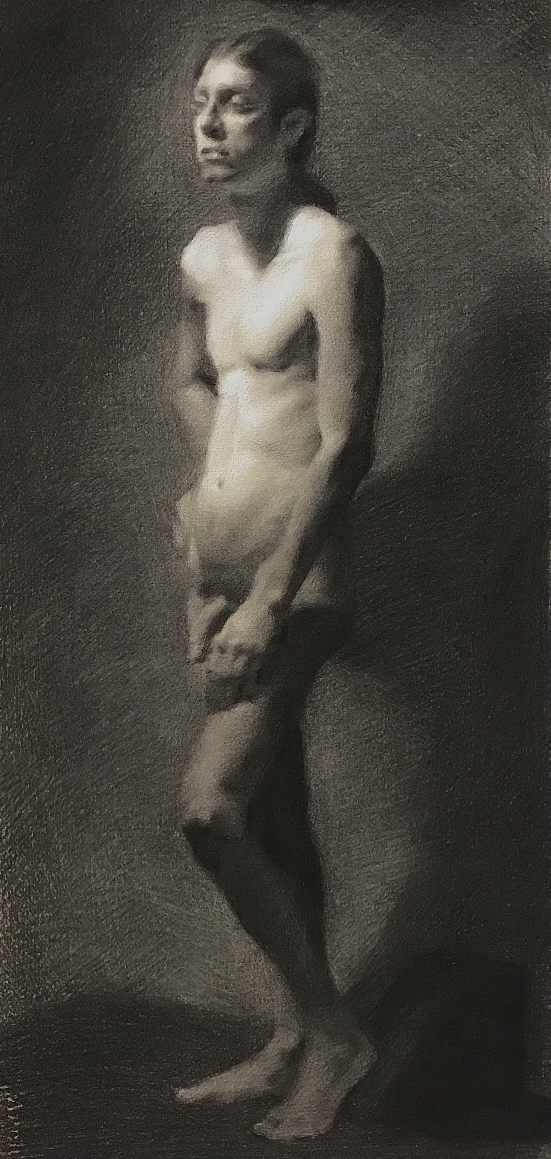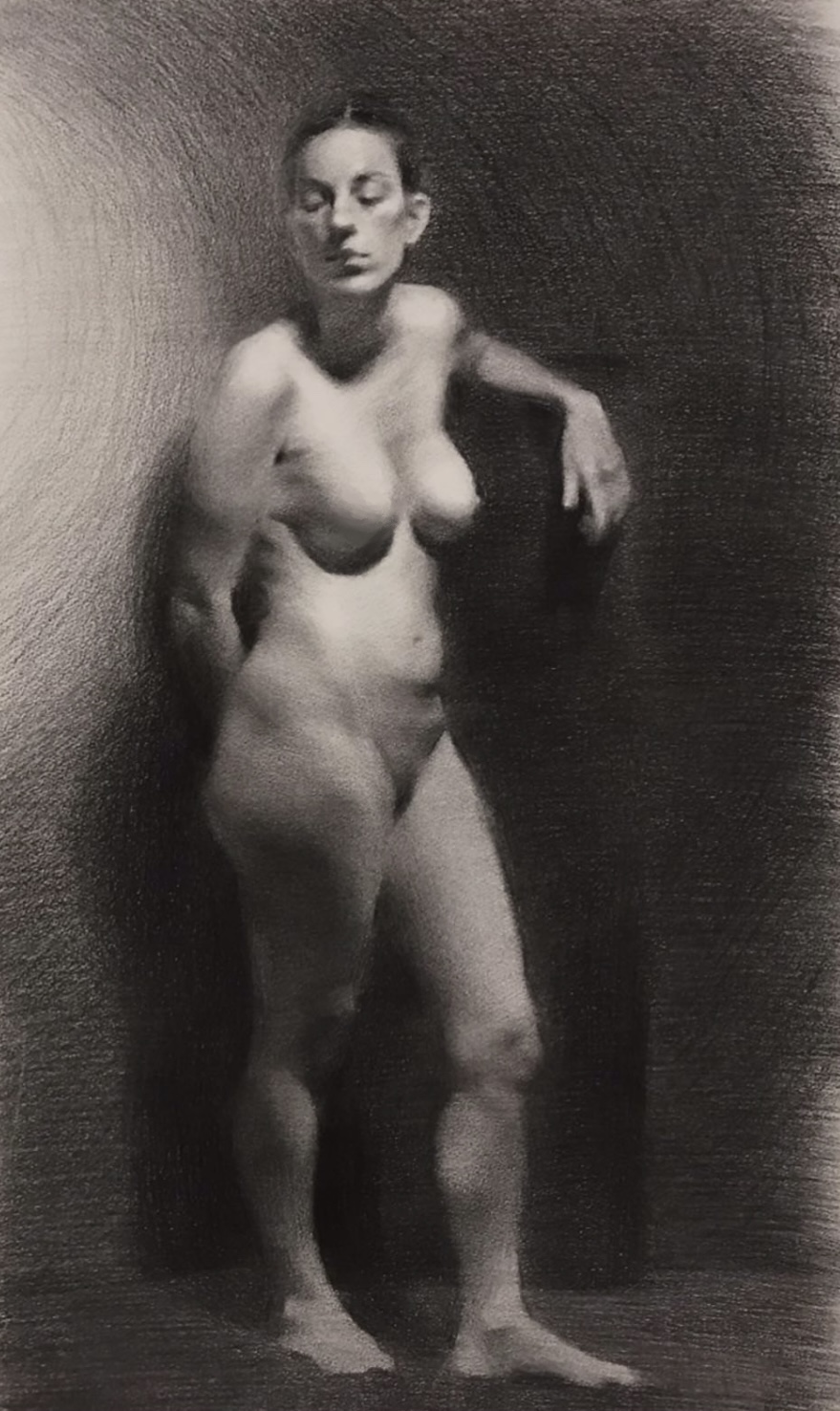 Across these years, she refined her understanding of form, value, and anatomy through sustained observational practice. Charcoal studies reveal her interest in subtle tonal transitions, while her painted works show an emerging attention to mood and interiority that would later define her personal artistic voice. The period marks a shift from technical mastery toward a more intuitive, introspective approach, laying the groundwork for the themes of solitude, memory, and emotional nuance that appear in her later series.